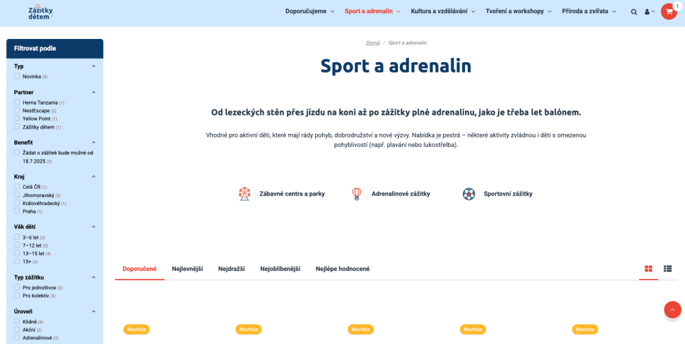 Procházejte nabídku zážitků pomocí filtrů (např. kraj, věk dítěte, typ zážitku).